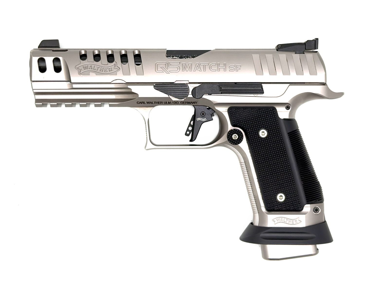Die Q5 Match Steel Frame Black Tie präsentiert sich als exklusive Sonderedition, die klassische Linienführung mit moderner Materialtechnologie vereint. Ihr markantes Erscheinungsbild sowie die hochwertigen Oberflächenbehandlungen sorgen nicht nur für einen effektiven Schutz vor Korrosion, sondern verleihen der Pistole zudem ihre edle, satinierte Optik.